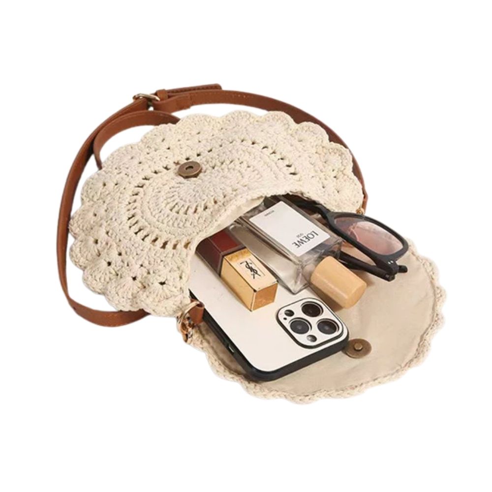 Crochet crossbody with scalloped flap front and adjustable PU leather-look strap for comfortable wear. Perfect for minimalist outfits, summer dresses, and casual weekends. Holds phone, small wallet, keys, and small cosmetics. Care: spot clean and avoid overstuffing to preserve shape.