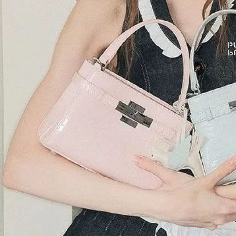 Structured mini satchel with croc-emboss texture, top handle, and detachable crossbody strap for styling options. Turn-lock style front hardware gives a polished look while keeping items secure. Fits phone, cards, small wallet, and makeup essentials. Includes decorative charm for added personality. Wipe clean; avoid sharp scratches on embossed surface.