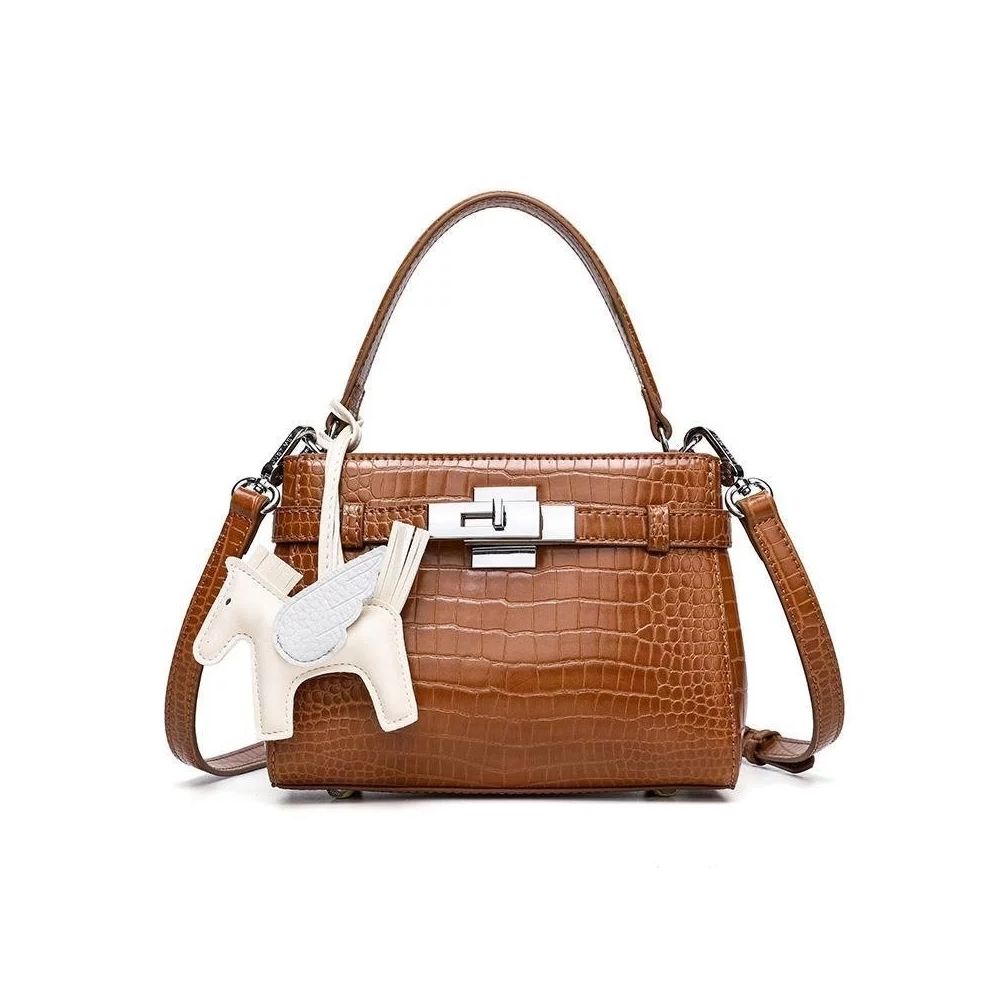 Mocha-toned croc-emboss structured mini satchel with top handle and crossbody strap. The polished front hardware elevates the look while keeping the bag secure. Great for work, weekends, and travel, carrying daily essentials comfortably. Wipe-clean PU finish; keep stuffed when stored to preserve shape.